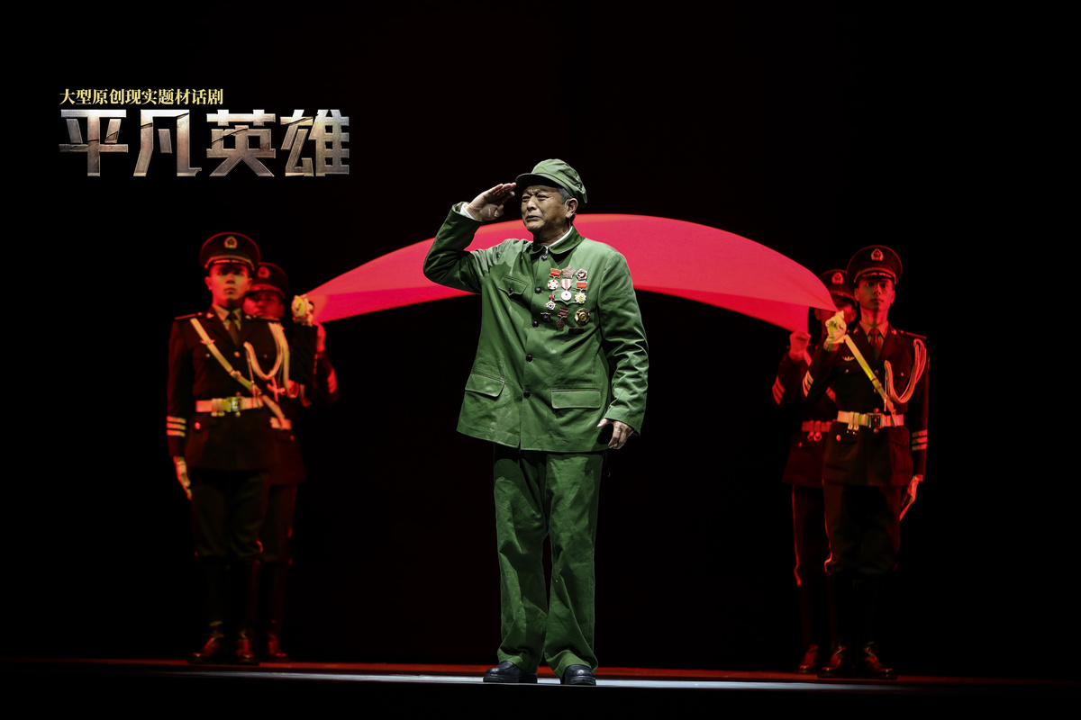 话剧《平凡英雄》先声夺人,以肃穆的“敬礼”声为叙事开篇,恰似一声打破寂静清晨的高亢啼鸣,两束白光之下礼兵步履铿锵迈入舞台。一面鲜艳的五星红旗瞬间展开,恰似共和国历史图卷宏阔展开。迅速拉开的帷幕,让两边手捧烈士遗骸的礼兵也完整呈现在观众视野。一位胸前挂满勋章的老人,以一个见证者的视角走入这个庄严时刻。历史与现实、生者与死者,通过不同时期两种军装的色彩对比,完成在同一空间的并置,使得话剧在最初的几秒钟,将“谁是英雄”这一问题随着震撼的视听抛诸观众。