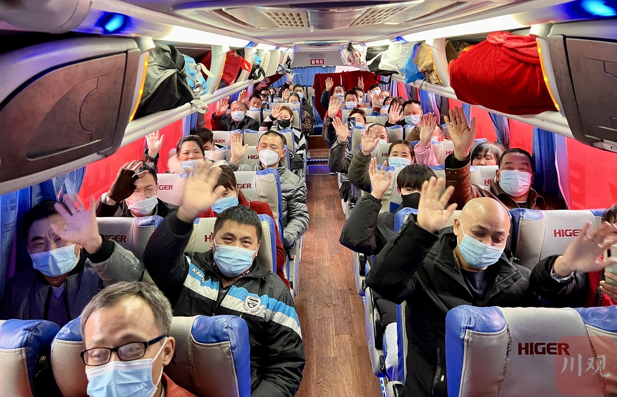 记者注意到,车身挂着“欢送隆昌籍农民工朋友返岗复工”标语,感情浓厚。有的农民工提着一袋土鸡蛋,小心呵护着放进随身携带的包中。