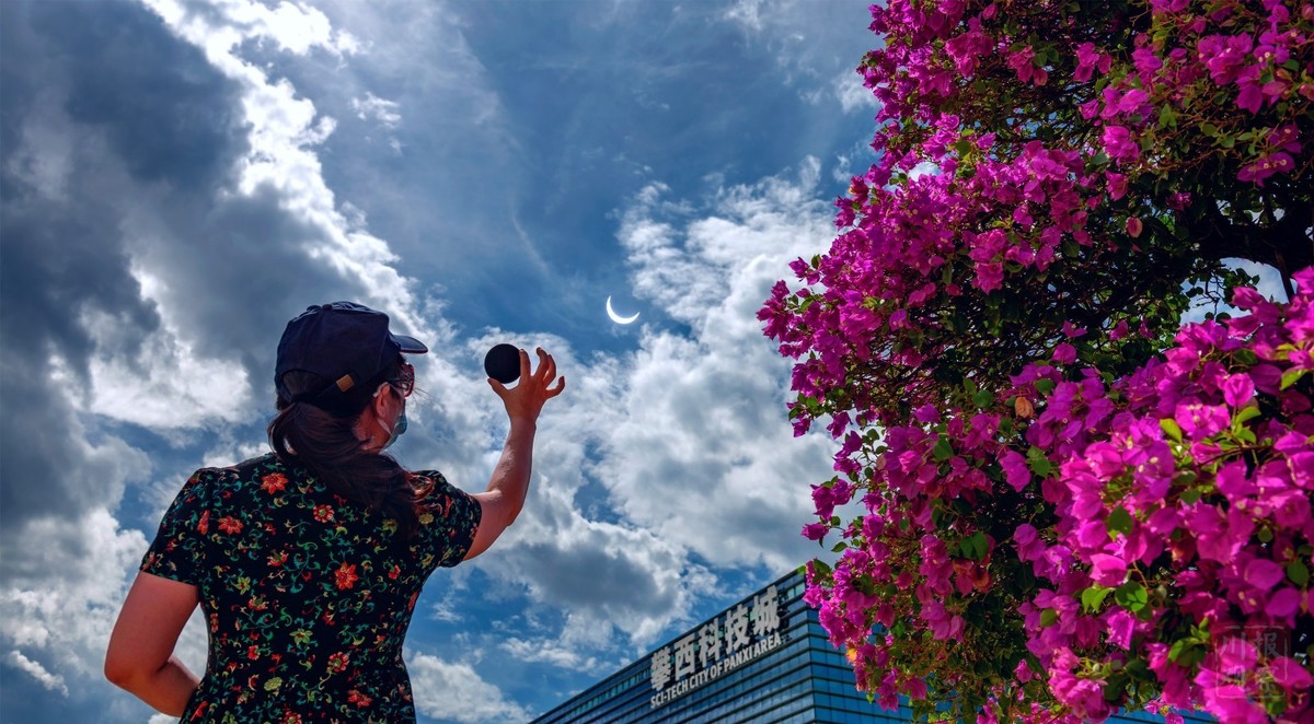 6月21日,夏至日,攀枝花再次发布高温橙色预警信号,比天气还火爆的“超级日环食”天文景观如约而至。因天气晴好,攀枝花“追日族”们如愿欣赏到“金环日食”。