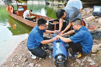 6月16日,工作人员在磨滩河水库准备机器人下水。