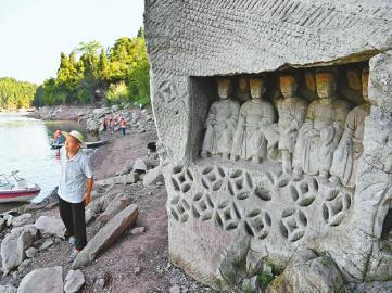 6月9日,书房坝水库旁的福济寺水下石刻造像因水位下降而露出水面。