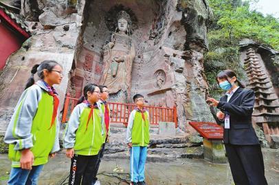 6月19日,圆觉洞工作人员向参观的学生们讲解文物。
