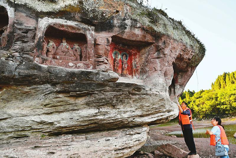 6月初,安岳县境内多个水库水位下降,当年因修建水库而淹没于水下的古代石刻陆续浮出水面。李家镇磨滩河水库中的这些石刻造像群是首次被当地水库巡逻员发现。