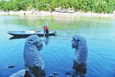6月9日,一对藏身书房坝水库的石狮因水位下降而露出水面。