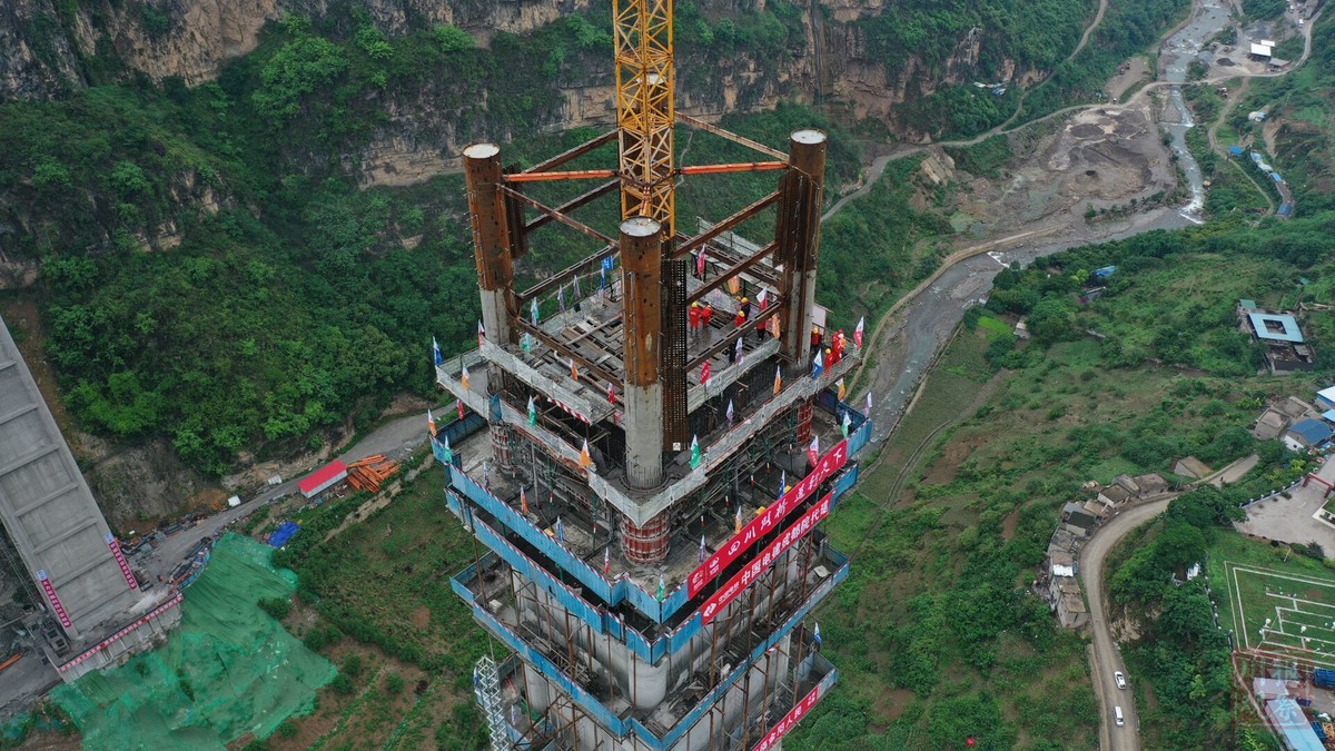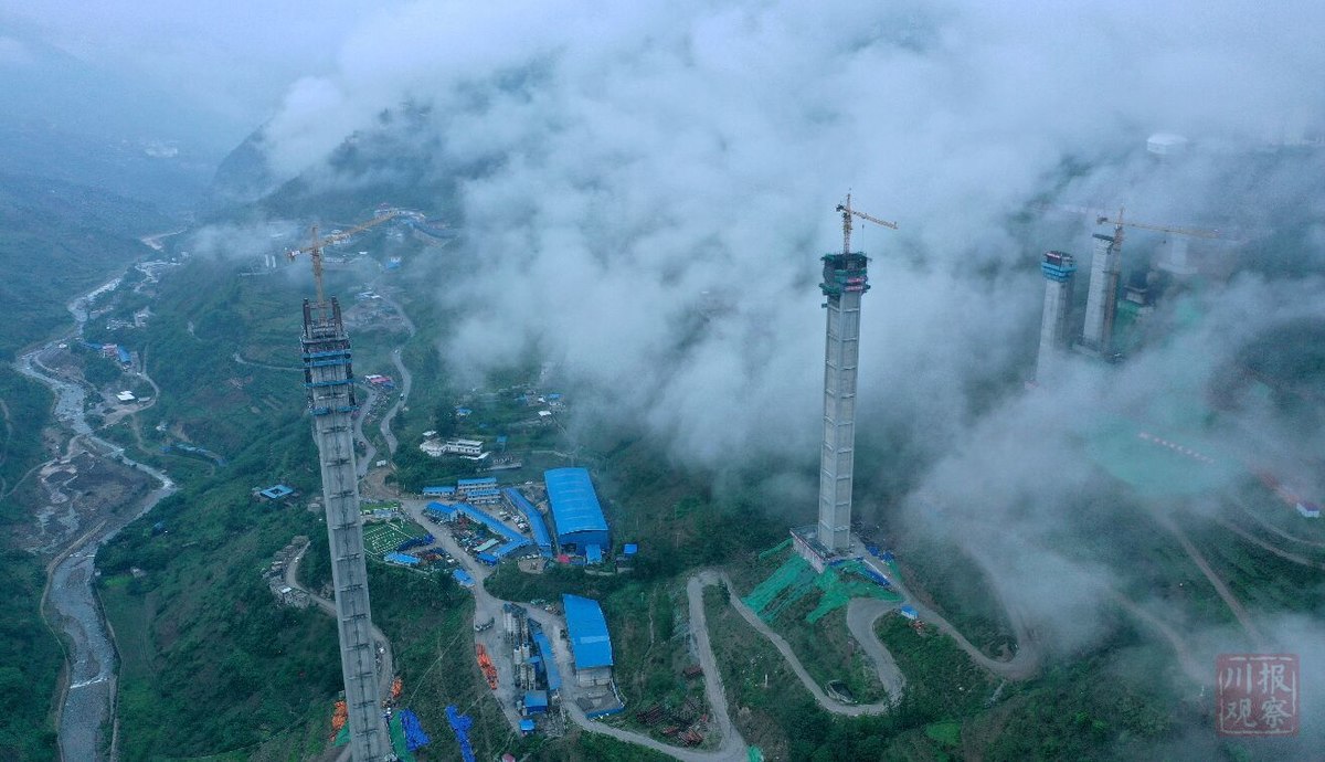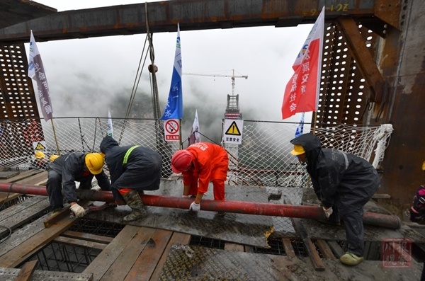 6月23日下午13时许,随着最后一泵混凝土的浇筑,金阳河特大桥高达196米的6号主墩封顶,世界最高连续刚构桥钢管混凝土格构空心墩的高度纪录由此刷新,成为中国桥梁建设的最新丰碑。