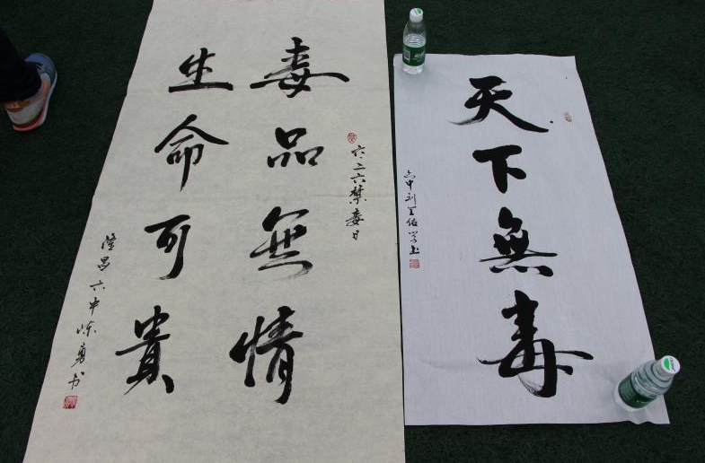 在活动现场,来自全市直属学校、中心学校的参赛师生约140人齐聚在隆昌市第一初级中学的绿茵场上。上午9时,活动正式开始,所有参赛师生依次上台在“健康人生,绿色无毒”的横幅上庄重地签上自己的名字。随着主持人一声比赛开始,参赛师生围绕活动主题开始挥毫泼墨,或书法写意,或绘画寓情,认真执笔,凝神纸上。“天下无毒”充满禁毒豪情!“毒品无情,生命可贵!”道尽禁毒大义!“同做守法隆昌人,共创无毒幸福城”写出大家的心声……