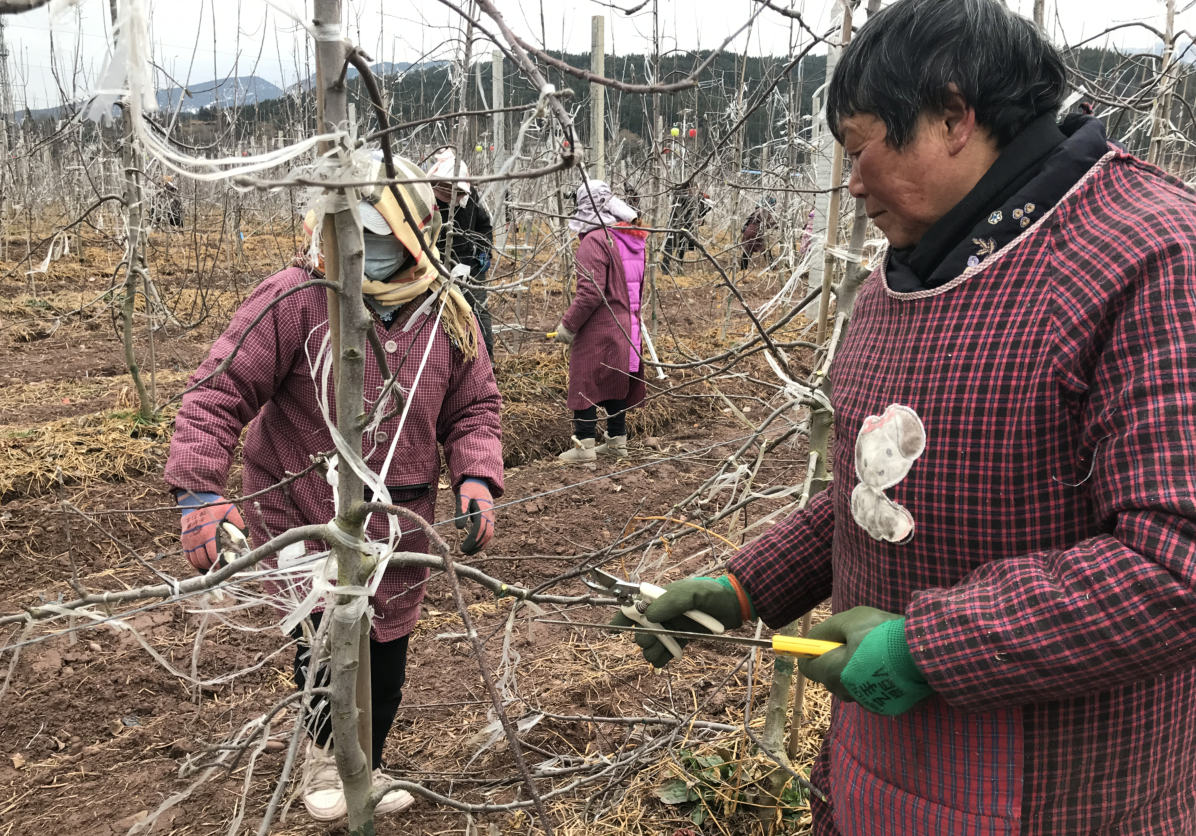 远处的山巅白雪皑皑,空中飘着小雪,寒风凛冽。然而,2月8日,在越西县现代农业产业园区,一个个在园区务工的农户已披挂上阵,手持剪刀、锯子等工具,展开了春节过后对苹果树的第一次冬季修剪。