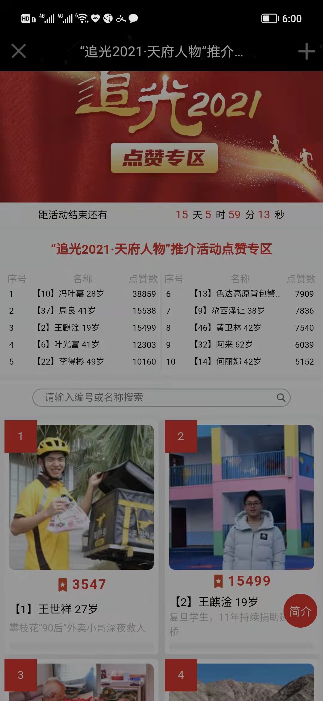 2021年12月底四川日报全媒体发起“追光2021”天府人物推介活动, 社会各界广泛关注、热情参与,全省183个县级融媒体中心联动响应,数十个省级部门、单位携手,大家一起共同寻找2021年里那些温暖四川的平凡英雄。在前期300多人报名的基础上,活动组委会初选出53名候选人进入下一轮的网络点赞环节,目前已有5位候选人点赞数过万。