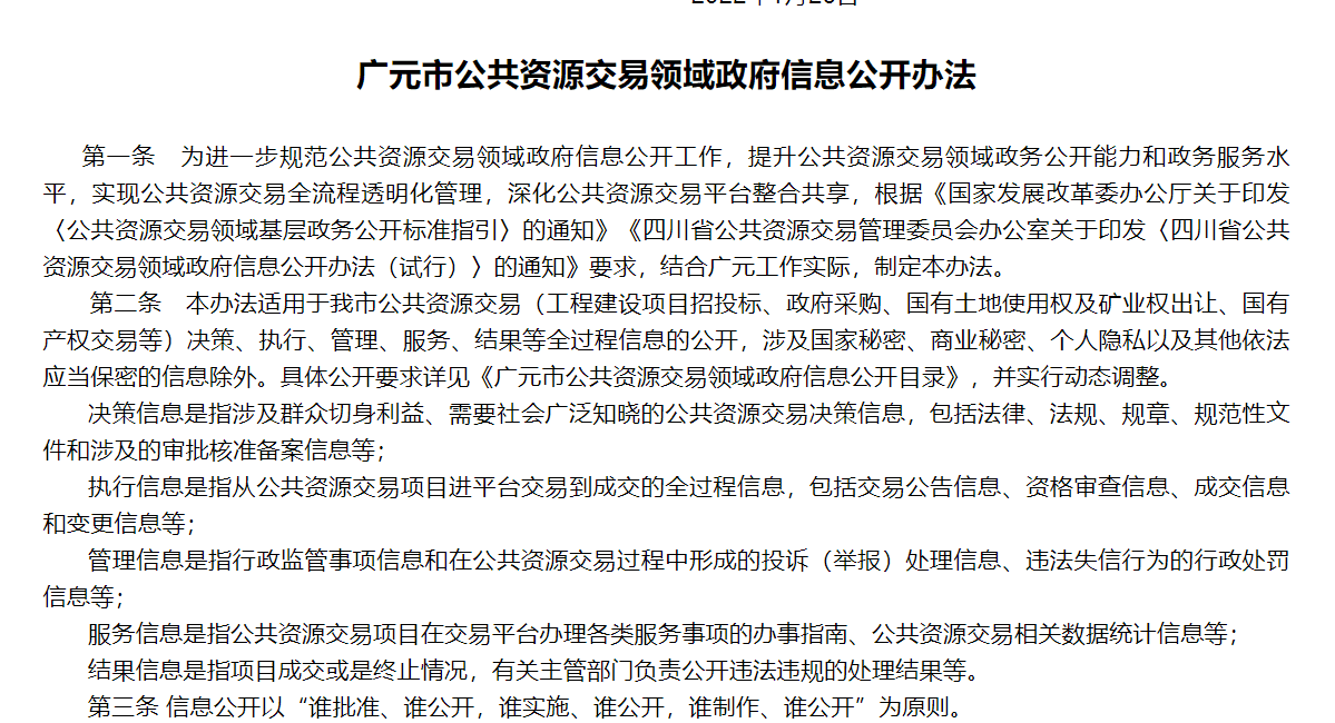 日前,广元市印发了《广元市公共资源交易领域政府信息公开办法》(以下简称“办法”),要求广元市公共资源交易(工程建设项目招投标、政府采购、国有土地使用权及矿业权出让、国有产权交易等)决策、执行、管理、服务、结果等全过程信息需公开。