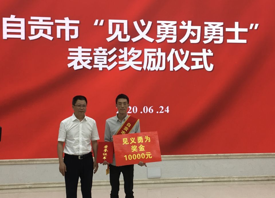 6月24日,自贡市见义勇为联席会议举行“见义勇为勇士”表彰奖励仪式,隆重表彰奖励徒手救下被困小女孩的胡云川。自贡市委常委、政法委书记刘笑禹向胡云川颁发“见义勇为勇士”荣誉证书、奖金1万元。