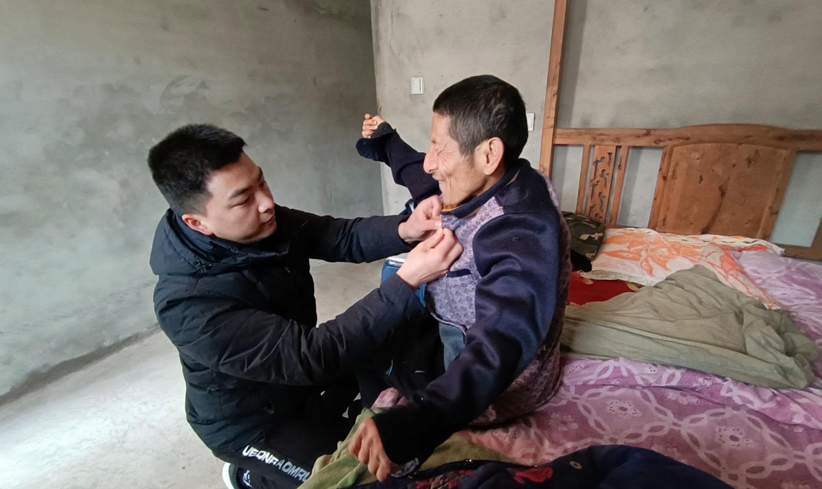杜敏照顾患有小儿麻痹症的幺爷爷日常起居。