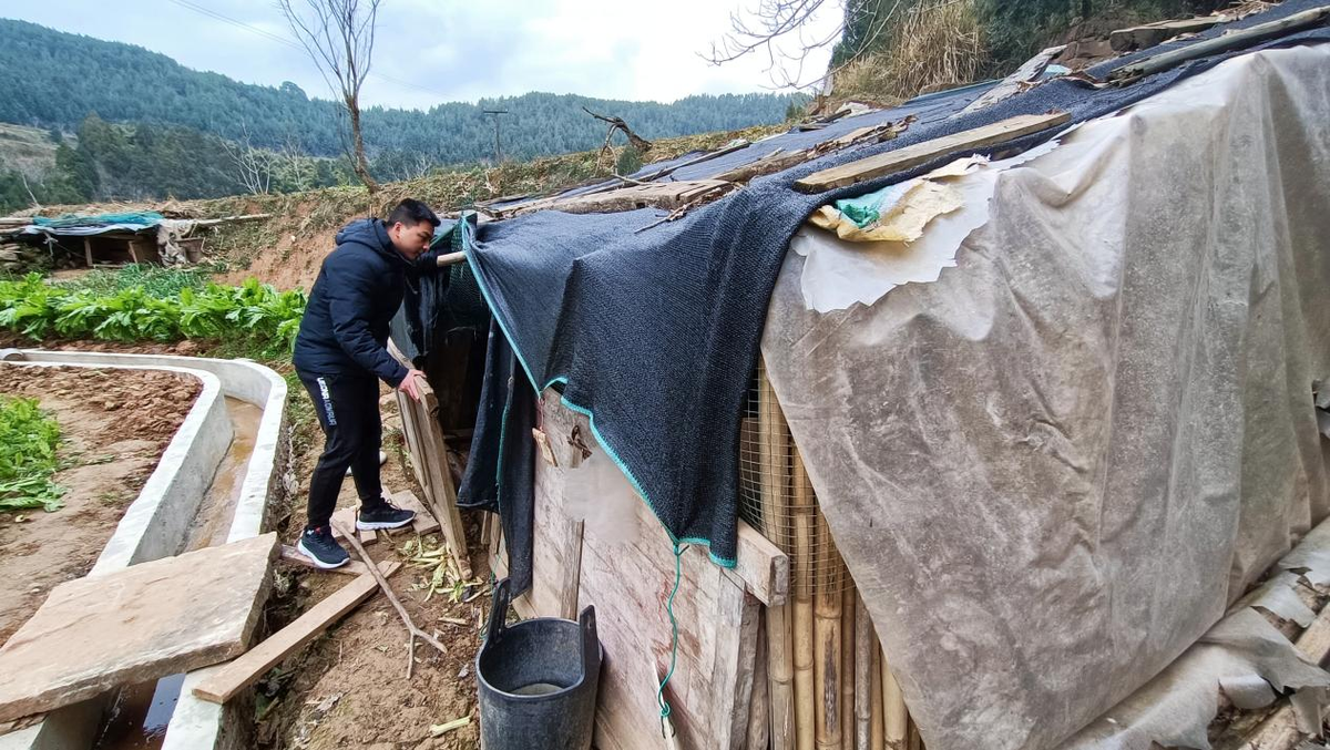 为方便奶奶养鸡,杜敏自己动手在田坎边搭建起了鸡棚。