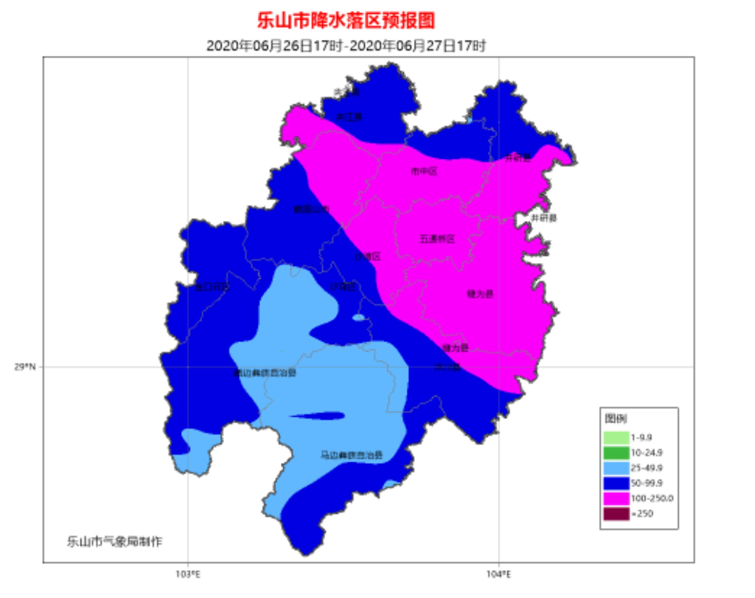乐山市气象台发布暴雨蓝色预警:预计26日傍晚到27日上午将有强降雨天气过程,全市普遍大雨到暴雨,其中市中区、五通桥区、沙湾区、夹江、峨眉、犍为、沐川、井研等地可达暴雨以上(50~100毫米),五通桥和犍为部分地区可达大暴雨(110~160毫米),过程时可能伴有雷暴、短时强降水、阵性大风等强对流天气。