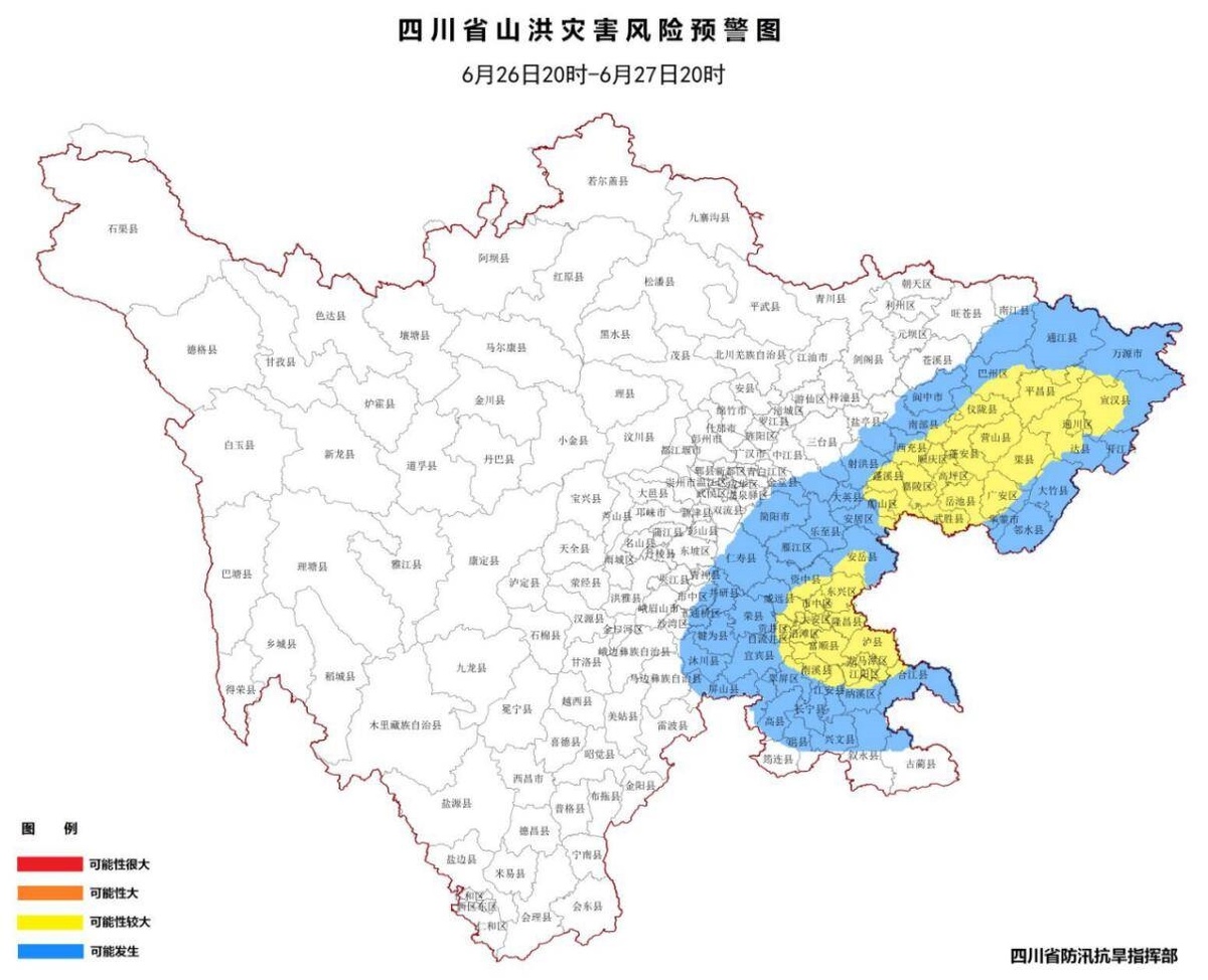 6月26日20时至27日20时,遂宁市船山区、蓬溪县,南充市顺庆、高坪区、嘉陵区、南部县、营山县、蓬安县、仪陇县、西充县,广安市广安区、前锋区、岳池县、武胜县,达州市通川区、达川区、宣汉县、渠县、万源市,巴中市巴州区、通江县、平昌县,资阳市安岳县,自贡市自流井区、贡井区、大安区、沿滩区、荣县、富顺县,泸州市江阳区、纳溪区、龙马潭区、泸县、合江县,宜宾市翠屏区、南溪区、江安县,内江市市中区、东兴区、威远县、资中县、隆昌市等县(市、区)发生山洪灾害可能性较大。