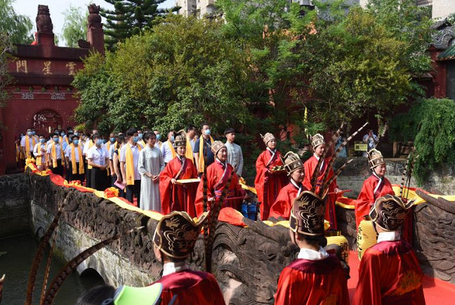 嘉宾在仪仗引领下从武庙广场向文庙缓缓前行。道路两边,身着古装服饰的学子分立两侧,象征孔子弟子72贤人行揖礼,呈现孔子六艺之“礼”。9点30分,举行文庙揭红开庙仪式。随后,在文庙内举行了祭孔大典。