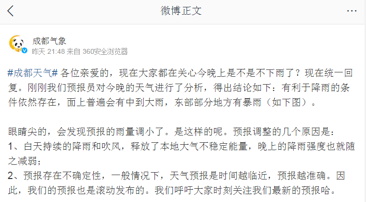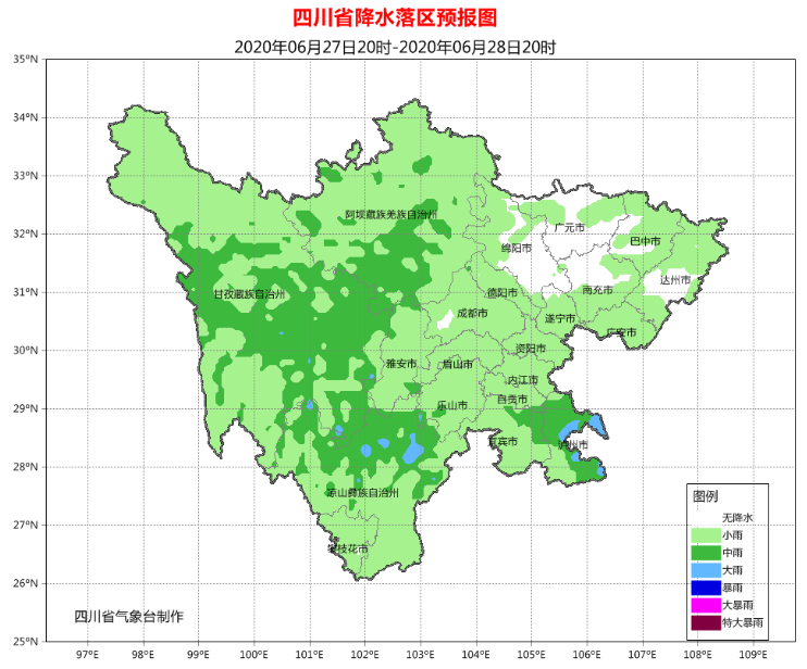 明天(6月28日)白天,盆地西北部以阴天间多云天气为主,其余地方阴天间多云有分散的阵雨或小雨;川西高原和攀西地区阴天间多云有雷雨或阵雨,雨量普遍小到中雨,其中凉山州东北部局部地方有大雨。