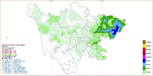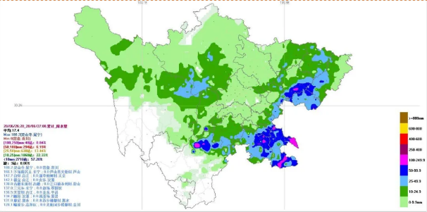 6月26日20时至27日08时,强降雨主要出现在南充、广安、达州、遂宁、资阳、内江、自贡、宜宾、泸州8市和凉山州东北部,暴雨294站,大暴雨40站,排名前三的降水量出现在凉山冕宁180.1mm、宜宾长宁166.1mm,泸州合江147.7mm。