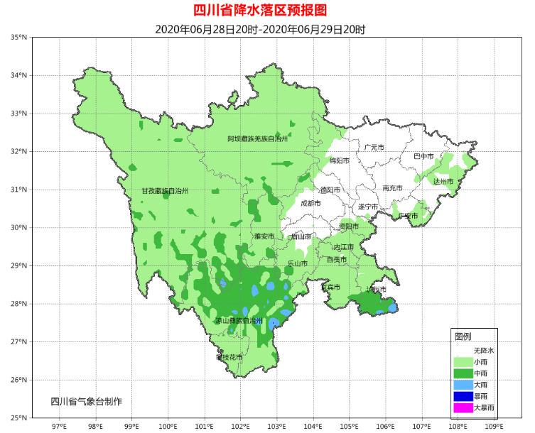 6月28日晚上到29日白天,雅安、乐山、宜宾、泸州、自贡、内江、资阳、广安、达州9市和西部沿山阴天间多云有阵雨或小雨,其中泸州南部有中雨,盆地其余地方多云;川西高原和攀西地区阴天间多云有雷雨或阵雨,雨量普遍小到中雨,其中凉山州局部地方有大雨。