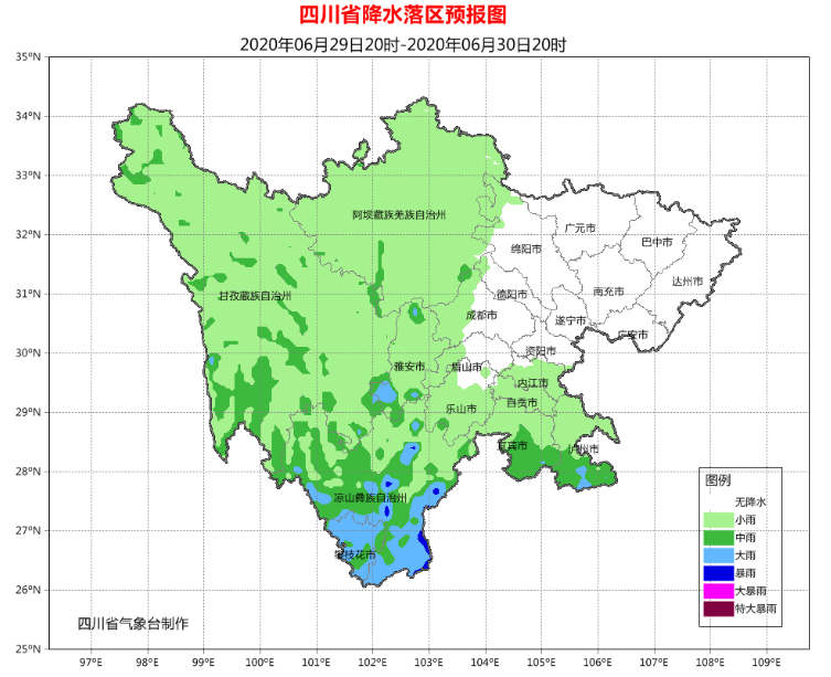 6月29日晚上到30日白天,盆地大部地方多云,其中雅安、乐山、宜宾、泸州、自贡、内江6市大部及西部区沿山多云间阴有阵雨,宜宾、泸州、雅安3市南部有中到大雨;川西高原阴天间多云有雷雨或阵雨,雨量小到中雨,攀西地区大部阴天有中到大雨,局部暴雨。