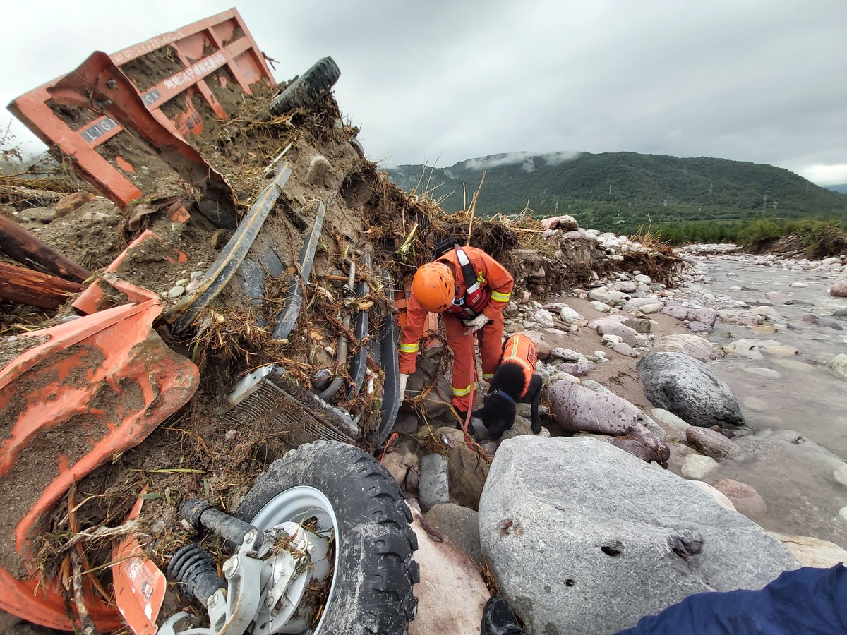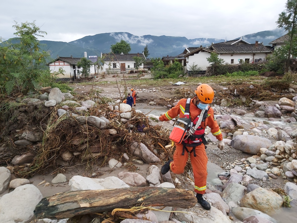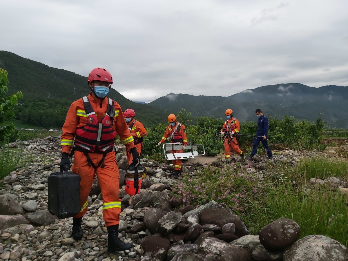 带上搜救犬、生命探测仪,消防队员逆河道而上,在沿岸的杂草、乱石中搜寻。冕宁当地的公安、民兵队伍也分批进入现场搜救。