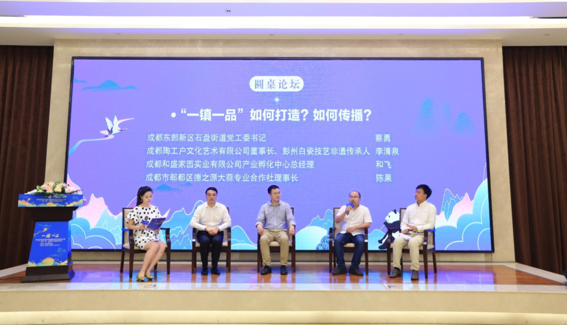 圆桌论坛环节,成都东部新区石盘街道党工委书记蔡勇,成都陶工户文化艺术有限公司董事长、彭州白瓷技艺非遗传承人李清泉,成都和盛家园实业有限公司产业孵化中心总经理和飞,成都市郫都区德之源大蒜专业合作社理事长陈果围绕“一镇一品”如何打造、如何传播分享了精彩观点。