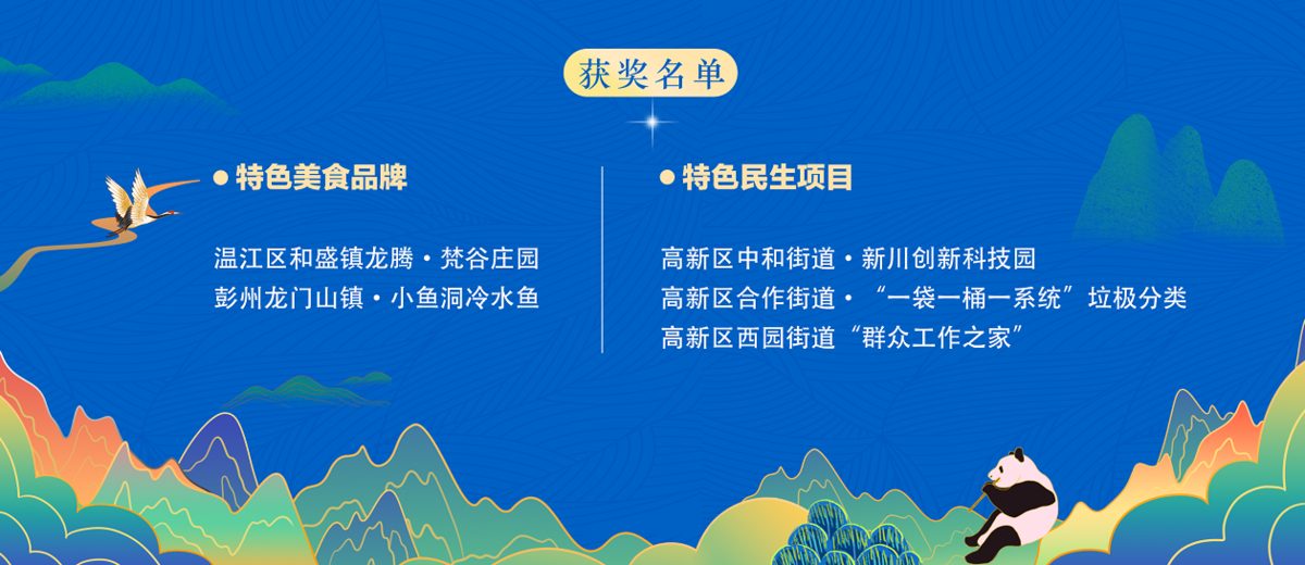 此次“一镇一品”传媒大奖获奖品牌各具特色,其中有以“龙泉驿区山泉镇”为代表的特色公园城市场景,以“双流区怡心街道城市院坝”为代表的特色人文场景,以“煎茶竹丝茄”为代表的特色农产优品,以“东部新区石盘街道晚白桃”为代表的特色人气水果,以“彭州白瓷”为代表的特色文创优品,以“温江区和盛镇龙腾·梵谷庄园”为代表的特色美食品牌,以“高新区中和街道·新川创新科技园”为代表的特色民生项目,以“崇州市街子镇”为代表的特色示范小镇等。