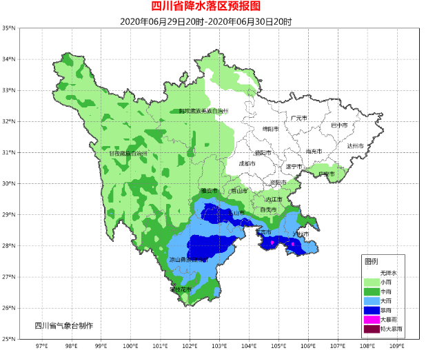 今天(6月29日)晚上,雅安、乐山、宜宾、泸州、自贡、内江6市及眉山西部有小到中雨,局部大雨,个别暴雨;川西高原南部有分散阵雨或雷雨;攀西地区有小到中雨,局部大雨。