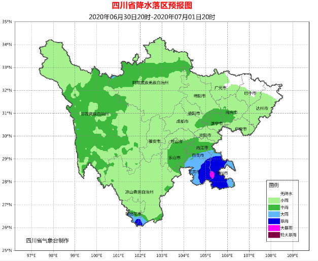 6月30日晚上到7月1日白天,盆地大部阴天有小雨,其中乐山、宜宾、泸州、自贡、内江5市和遂宁北部及南充南部有中到大雨,宜宾、泸州2市的部分地方有暴雨,个别大暴雨;川西高原和攀西地区有阵雨或雷雨,其中甘孜州大部、阿坝州北部及攀西地区南部有中雨,局部大雨,个别暴雨。