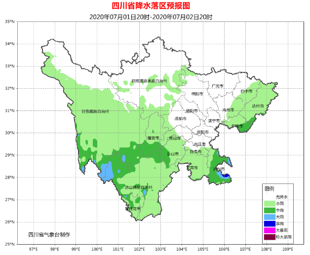 7月1晚上到2日白天,雅安、乐山、宜宾、泸州、达州、广安6市和巴中、南充2市东部及眉山西部有小雨,局部中雨,个别大雨;甘孜州中部南部、阿坝州南部有分散阵雨或雷雨,其中甘孜州南部有中雨;攀西地区有小雨,其中西部有中雨,局部大雨。