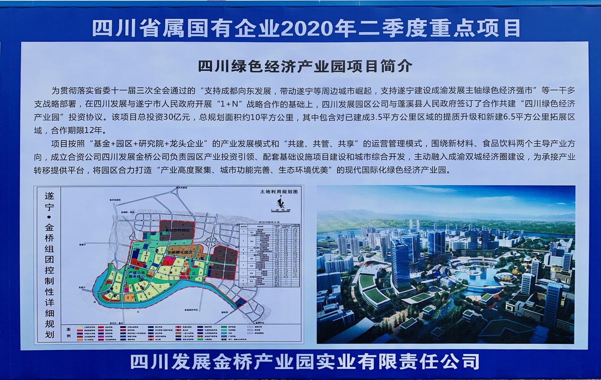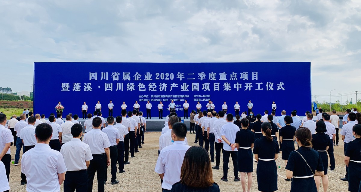 集中开工主会场设在位于遂宁市蓬溪县的四川绿色经济产业园项目。该项目由四川发展与当地政府联合投资打造,总投资30亿元,总规划面积约10平方公里,合作期限12年。今年计划实施投资7亿元,重点实施园区配套基础设施建设等。按照规划,该项目主要以新材料和食品饮料为主导产业,既是省属国企与地方政府联手助推县域经济发展的一次探索实践,也是双方积极主动融入成渝地区双城经济圈建设,为承接产业转移打造的一个重要平台。