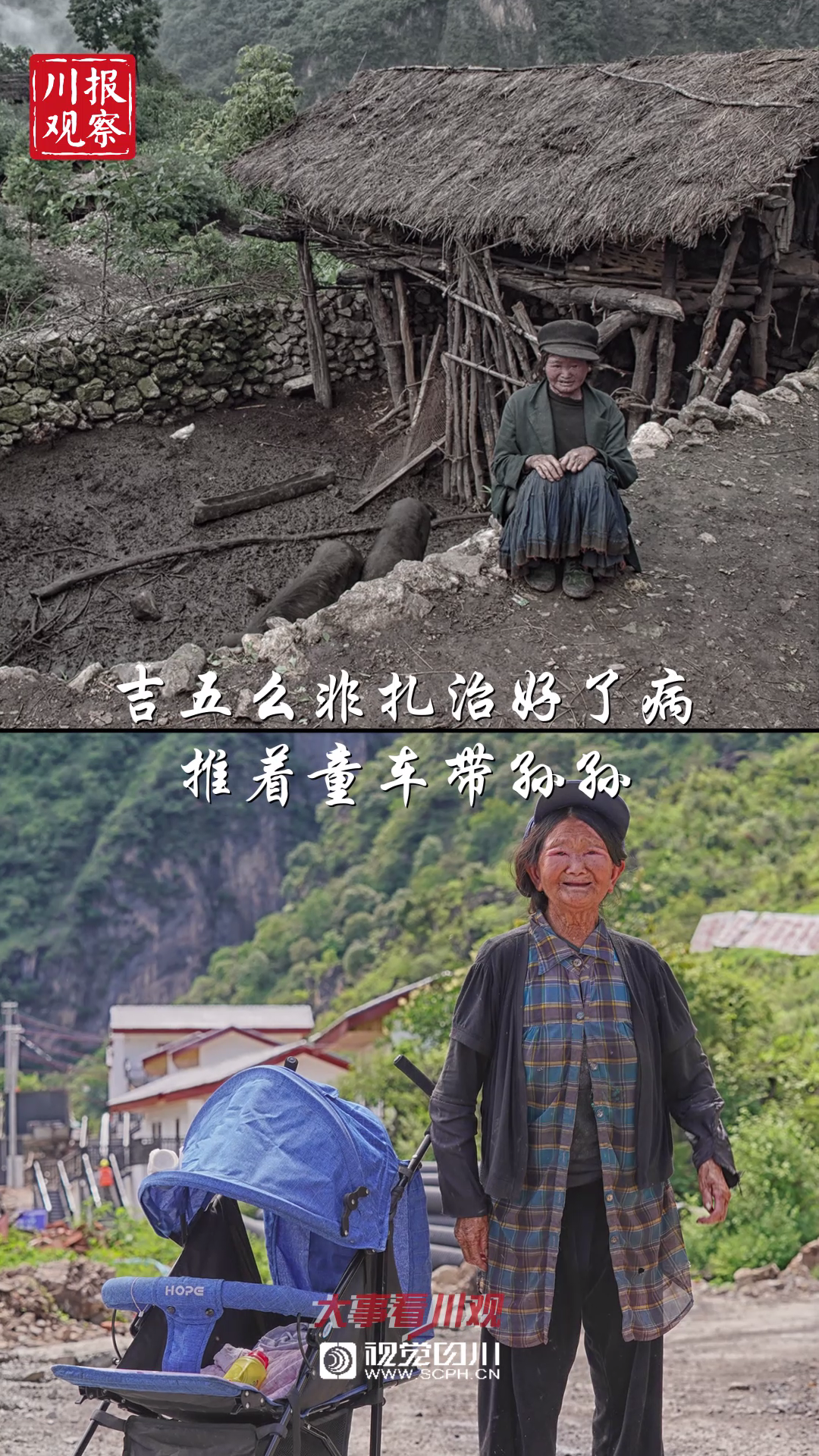 ▽在茅草屋边枯坐的吉五么非扎治好了病,身边是新买的童车,正等着小孙子回来给他一个惊喜。