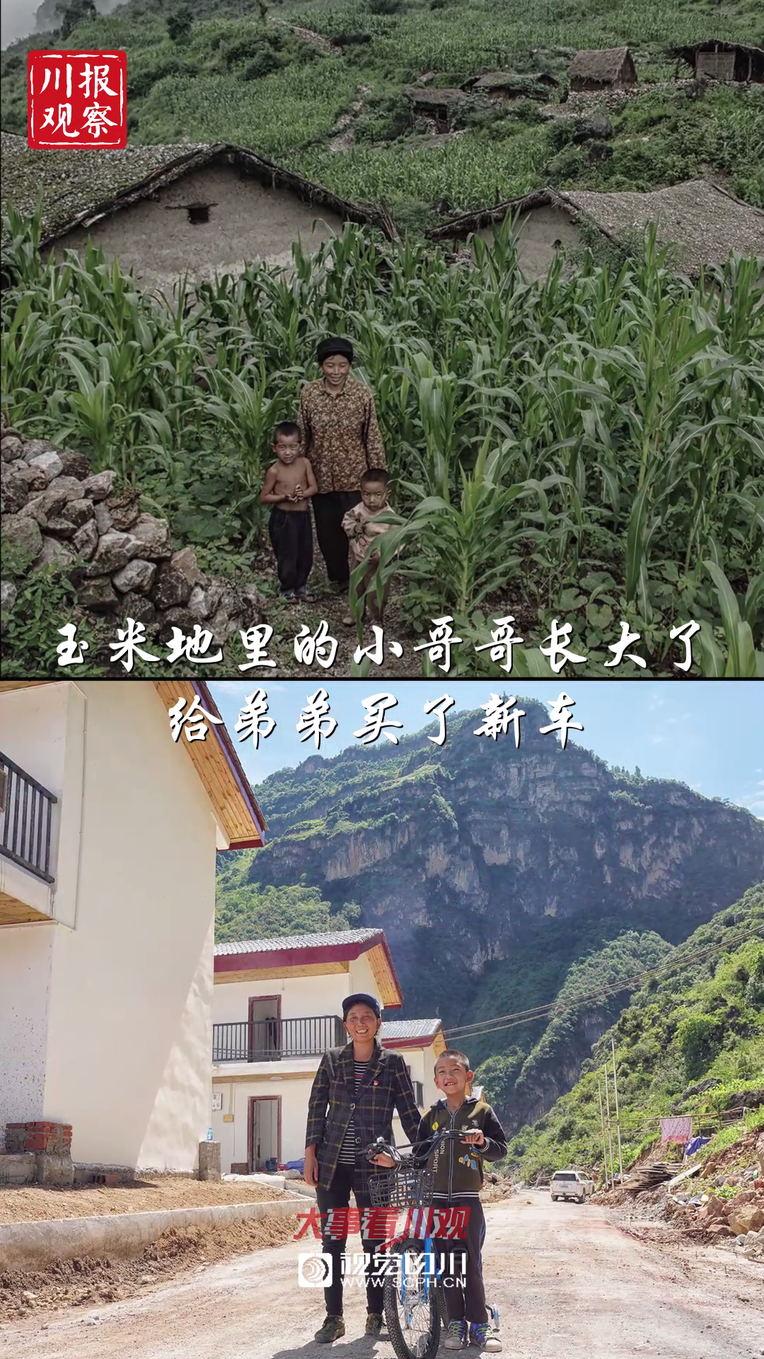 ▽玉米地里的哥儿俩长大了,听说公路通到家门口,在外地工作哥哥专门给弟弟买了一辆自行车。