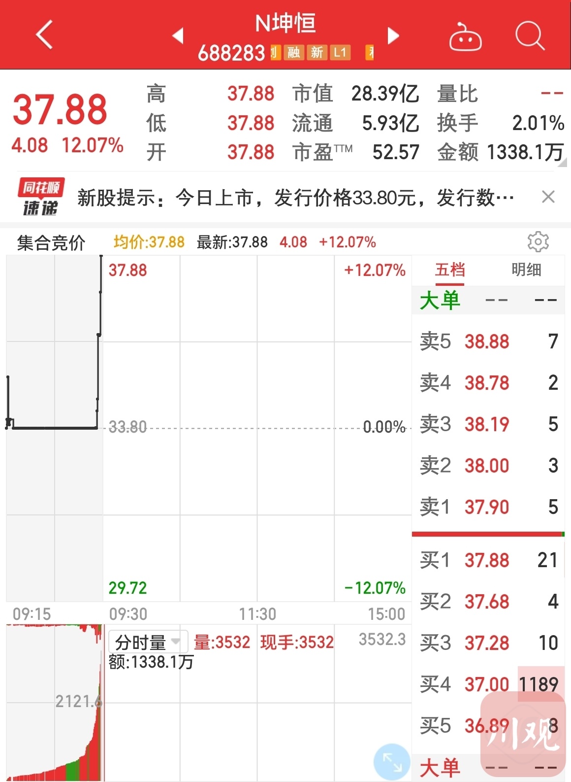 2月15日上午,四川企业成都坤恒顺维科技有限公司在上海证券交易所西部基地敲响上市锣声。首日发行价33.8元,开盘价为37.88元,涨幅12.07%。