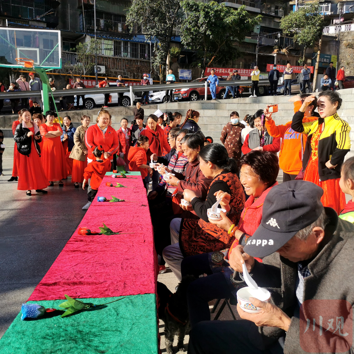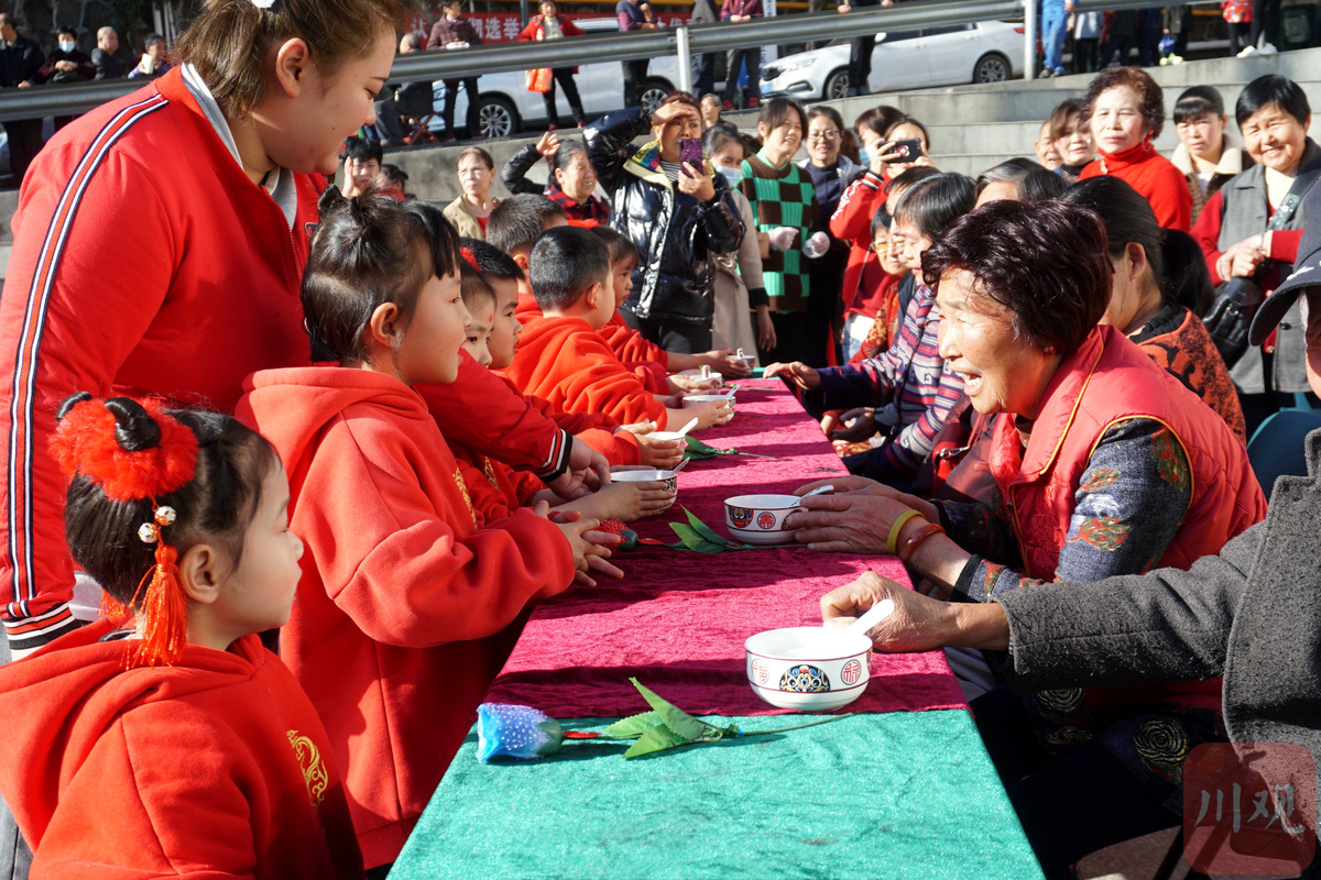 “爷爷奶奶,元宵节快乐!”当天上午,东区弄弄坪街道大地湾社区广场上,社区幼儿园的小朋友将一碗碗热气腾腾的汤圆,送到看文艺表演的社区老人们手中,用稚嫩童声为他们送去节日祝福。