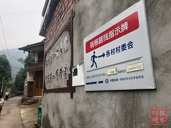 雅安市雨城区上里镇五家村(原白马村),农户的房屋外墙上挂着汛期转移路线指示牌。