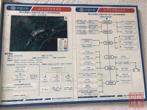 6月26日,在雅安市雨城区上里镇五家村,记者看到在沿公路的村民房屋外墙上,每隔一段距离都张贴着一块"山洪灾害防御预案"提示牌。提示牌上公布了雨城区防汛应急值班电话,以及从镇到各村应急值班干部的电话。提示牌还用图文详细标注解释了危险源、预警指示、预警信号、危险区责任人等信息。