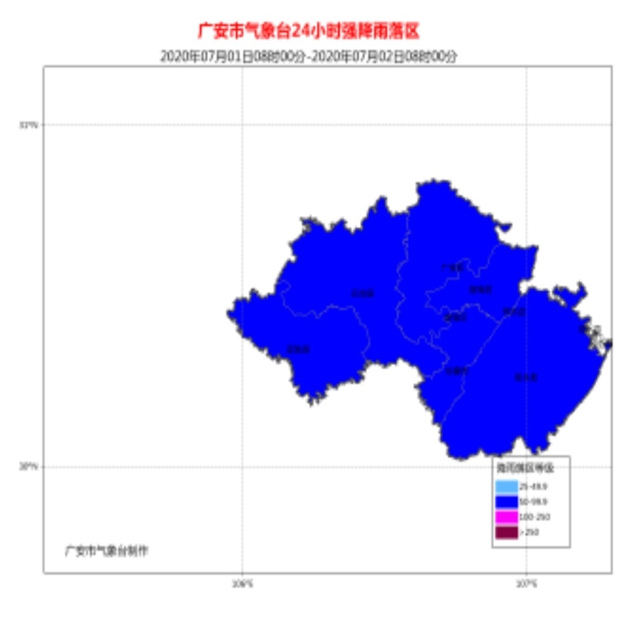 7月1日早上,广安市气象台发布暴雨蓝色预警,预计7月1日08时至2日08时,广安区、岳池县、武胜县、邻水县、华蓥市、前锋区6区县将出现50毫米以上降雨,局部超过100毫米。请注意防范。