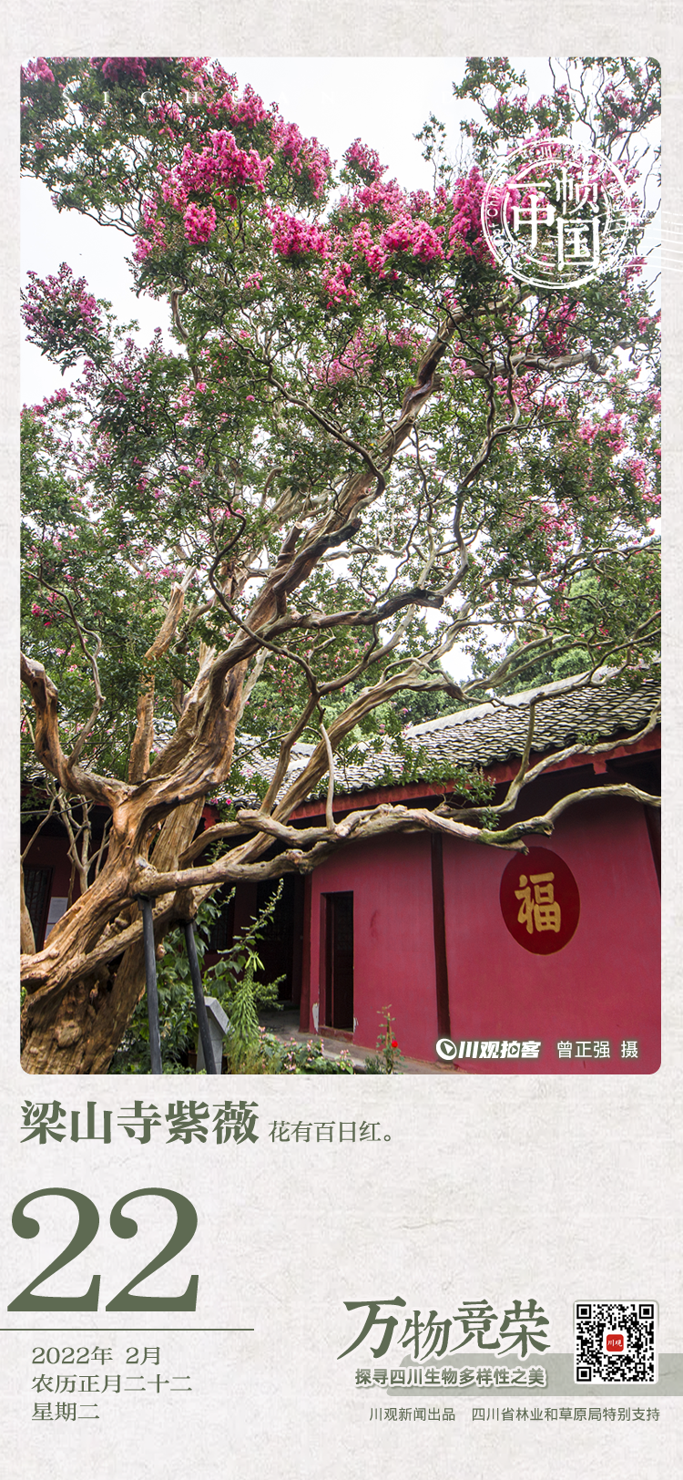 梁山寺紫薇,千屈菜科,紫薇属,落叶灌木或小乔木。树皮平滑,灰色或灰褐色 ;枝干多扭曲,小枝纤细,略成翅状。叶互生,有时对生,纸质,椭圆形、阔矩圆形或倒卵形 ;花淡红色或紫色、白色,荣获四川省“百佳古树名木”称号。