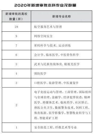 在2020年新增审批的177个本科专业名单中,航空服务艺术与管理专业新增最多,有29所高校新增。但从专业所属科类来看,新增审批专业则以医学相关专业为主,包括临床医学、中医骨伤科学、眼视光医学、预防医学、口腔医学、中医康复学、精神医学、临床药学、医学影像学等。