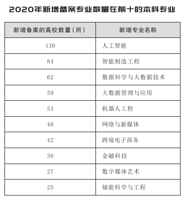 在2020年新增备案的2046个本科专业名单中,人工智能专业成为最“热门”的专业,共有清华大学、北京语言大学、华北电力大学等在内的130所高校新增。人工智能“热”与国家战略有关。2017年,国务院印发的《新一代人工智能发展规划》,将人工智能定义为“重大战略机遇”,要“构筑我国人工智能发展的先发优势,加快建设创新型国家和世界科技强国”。此后的2018年和2019年,全国分别有35所和179所高校开设了人工智能专业。