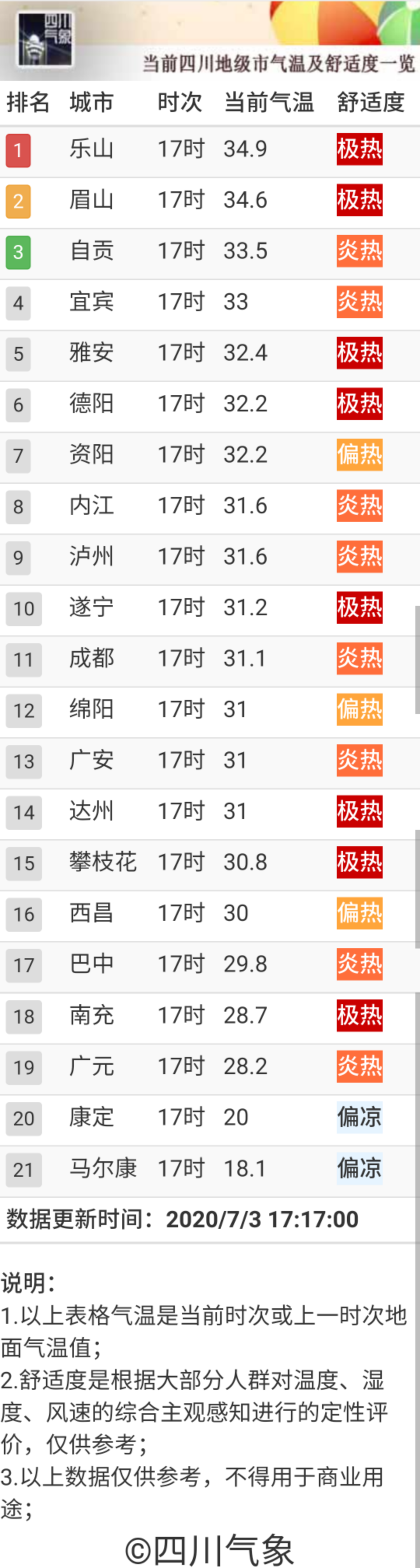 刚刚经历了有气象记录以来第二热的6月,7月1日至2日(周三、周四),全省又有不少县(区、市)飚了高温,比如成都、乐山、绵阳的部分地区。今天(7月3日)各地的气温也不算低——直到下午17时,全省21个市州还有16个站在30℃以上,领头的乐山市平均气温接近35℃。