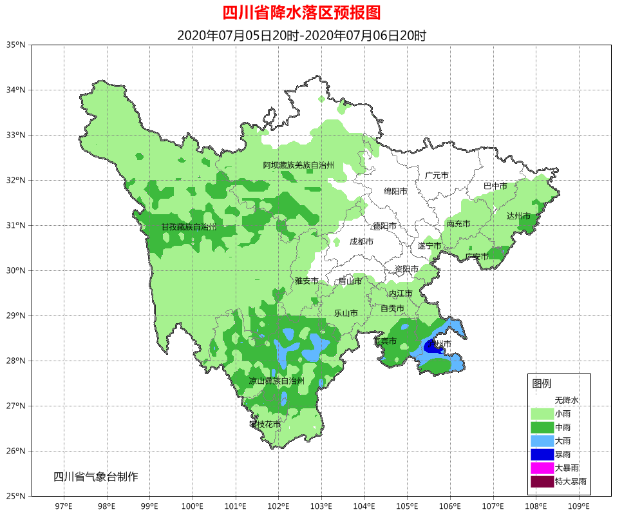 7月4日晚上到5日白天,盆地各市阴天有阵雨或雷雨,其中雅安、乐山、宜宾、泸州、自贡、内江、资阳、遂宁、广安、达州10市的部分地方有中到大雨,局部暴雨;川西高原和攀西地区阴天有阵雨或雷雨,雨量普遍小到中雨,凉山州东北部有大雨。