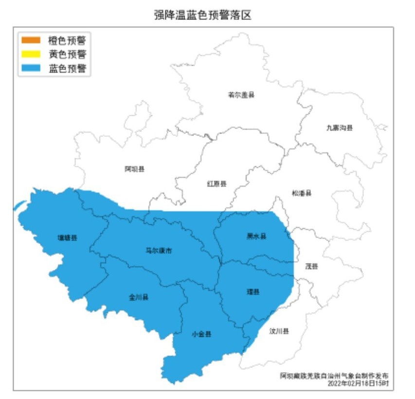 阿坝州气象台2月18日下午发布强降温蓝色预警:受高原切变缓慢东移和地面冷空气的共同影响,预计19日到22日,阿坝州有一次明显降温天气过程,全州大部日平均气温将累计下降4~6℃,其中壤塘县、马尔康市、理县、金川县、小金县、黑水县日平均气温将累计下降5~7℃,过程期间可能伴有阵性大风。