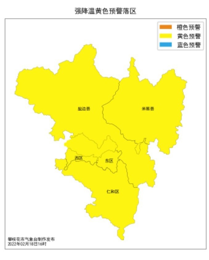 2月18日16时25分,攀枝花市气象台发布强降温黄色预警:预计20日开始,攀枝花市有一次强降温降水天气过程,全市日平均气温累计下降8~10℃,22日最高气温将下降至11~13℃。全市阴有小雨,局部中雨,高山有雨夹雪或小雪,山区道路易出现结冰,并可能出现雷电、大风等局地强对流天气,冷空气影响时山口河谷地区有4-6级偏北风。过程后期,22至24日平坝河谷可能有霜冻,请注意预防强降温、道路结冰、强对流、霜冻天气带来的不利影响。