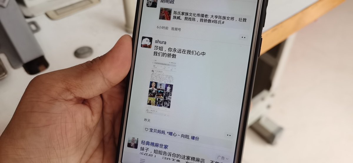 李莎离世后,在成都读大二的表弟胡学涛在自己的朋友圈发布“莎姐,你永远在我们心中,我们的骄傲。”