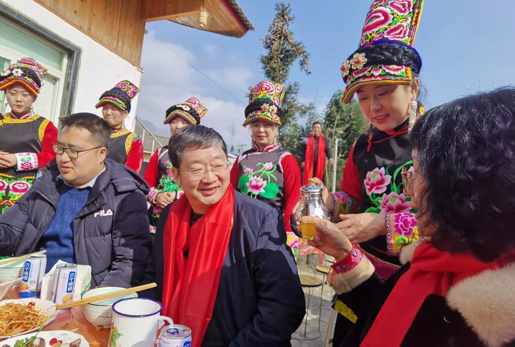 董进智(前排左二)在北川县坝底乡坪山村年猪节上。