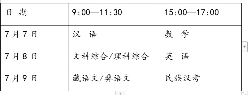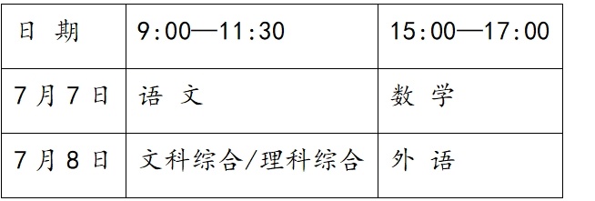 全省高考(一类模式高考除外)于7月7、8日统一组织进行。各科目考试时间(北京时间)安排如下: