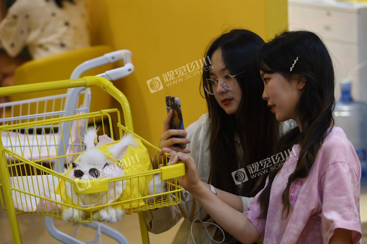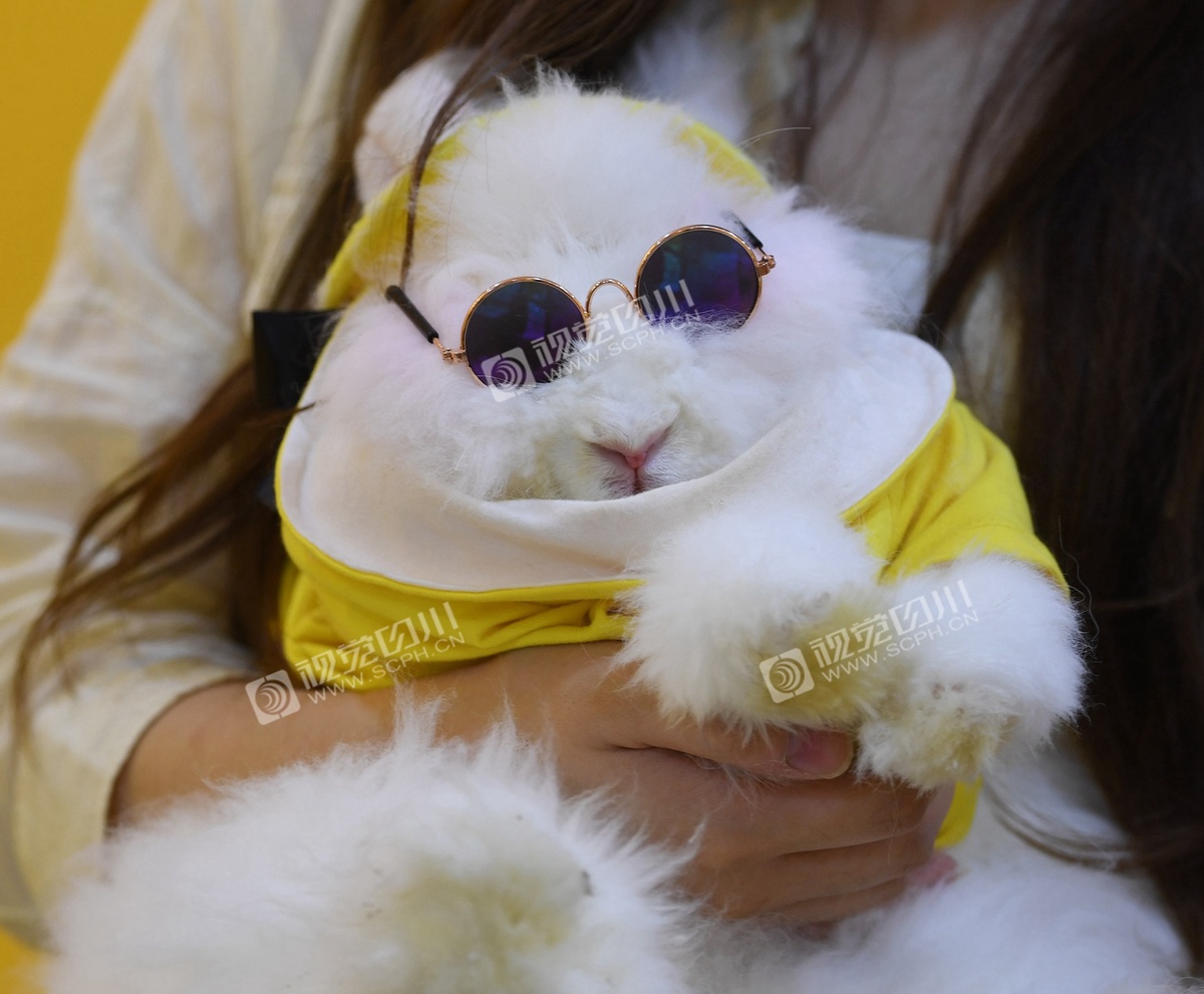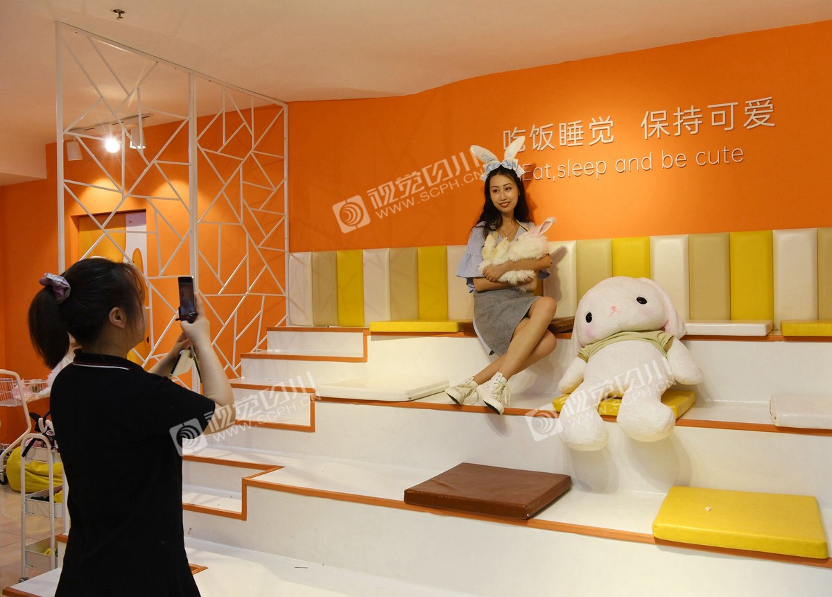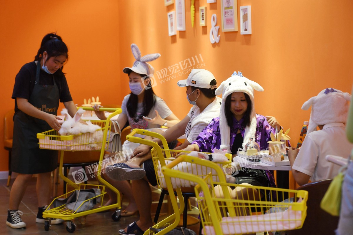 7月的周末,成都市春熙路一家商业综合体内,一家名为“爱玩萌兔体验馆”内坐满了前来拍照、打卡的年轻人,安哥拉兔们有的穿上了定制服装、有的涂上了淡粉色腮红,有的惬意地躺在小推车里,还有的依偎在顾客的怀抱中。