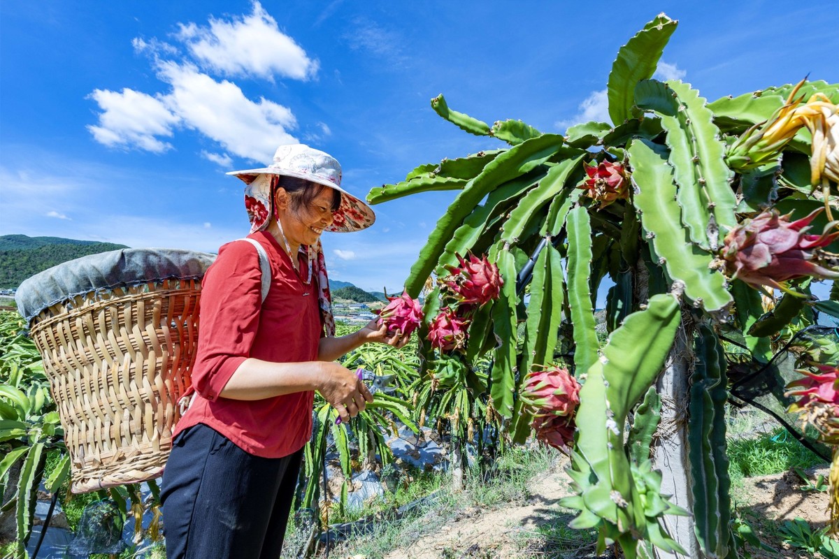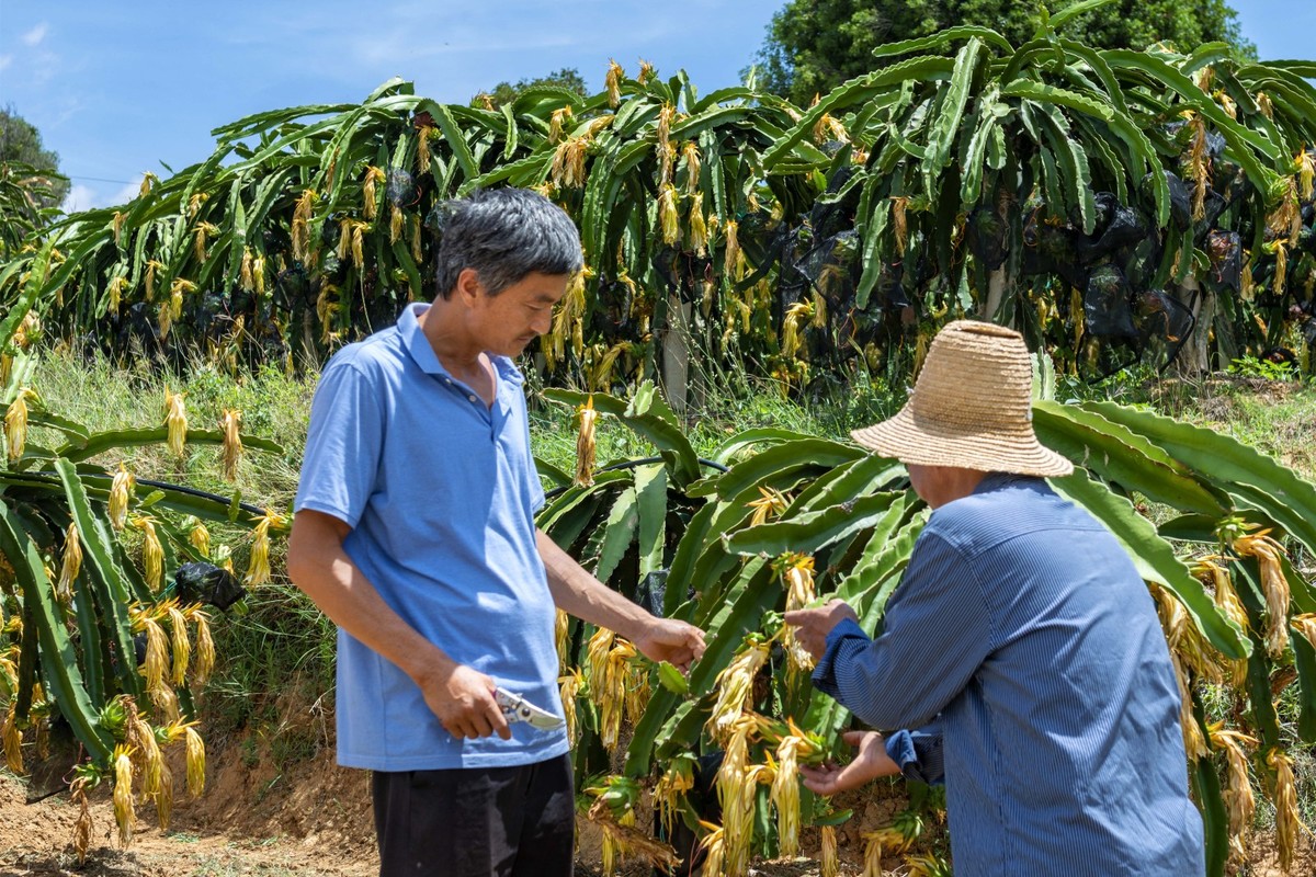 6月30日,攀枝花市仁和区大龙潭村的火龙果迎来丰收,顶着烈日,村民钱忠红和妻子在自家火龙果田里忙着剪花、整理套袋。为了种好火龙果,他给自己提出“997”的要求:早9点到园,晚9点出园,一周7天不休息,“家里的10亩地,要管理好得花功夫,一天在地里呆10多个小时。”虽然每天忙碌,但钱忠红却很高兴,“能见得到效益,日子也过得比从前好,累点都不怕,有盼头。”