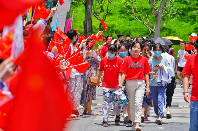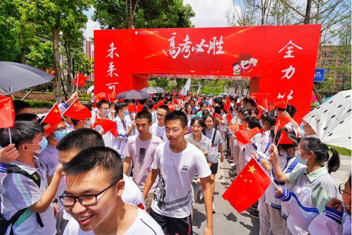 随后,在各班主任的陪伴下,198名高三考生列队出发,前往位于高新区的两个考点。高一、高二年级师生、学校其他教职员工和家长代表手持红旗,在送考通道两侧夹道欢送。一名高一年级的男同学对记者说,为学长们送行他感到非常激动:“不是对手弱,只是我们强!”相信高三的学长们一定能够考出好成绩。